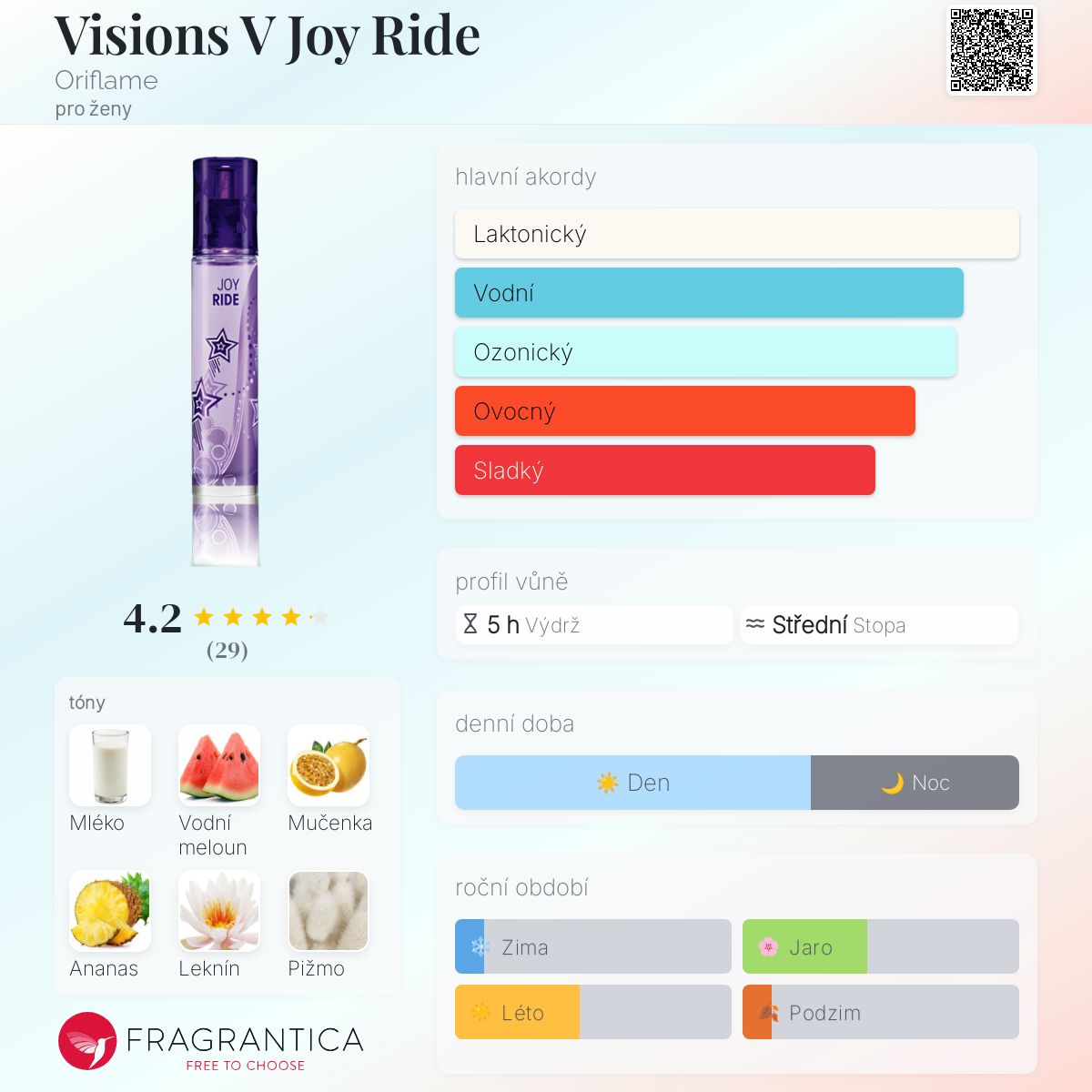 Visions V Joy Ride podle Oriflame je Floral Fruity vůně pro ženy. Visions V Joy Ride byl/a uveden/a v roce 2009. "Nosem" za touto vůní je Philippe Roques. Vrchní tóny jsou Vodní meloun, Mučenka a Sladký pomeranč; střední tóny jsouAnanas, Leknín a Brambořík ; základní tóny jsou Mléko, Pižmo a Jantar (ambra).
