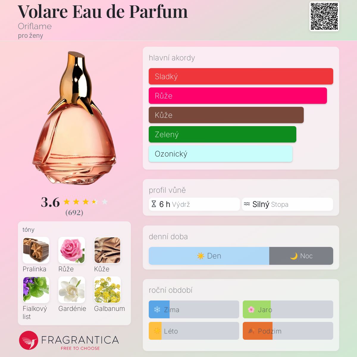 Volare Eau de Parfum podle Oriflame je Floral vůně pro ženy. Volare Eau de Parfum byl/a uveden/a v roce 2014. "Nosem" za touto vůní je Fabrice Pellegrin. Vrchní tóny jsou Fialkový list, Galbanum a Hruška; střední tóny jsouOkvětní lístky růží, Gardénie a Pivoňka ; základní tóny jsou Pralinka, Kůže a Cedr.