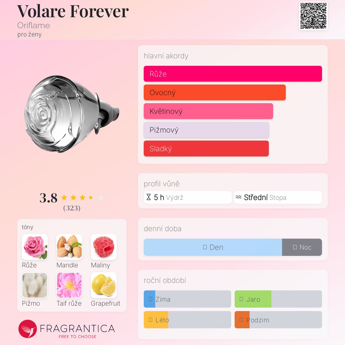 Volare Forever podle Oriflame je Floral vůně pro ženy. Volare Forever byl/a uveden/a v roce 2016. "Nosem" za touto vůní je Vincent Schaller. Vrchní tóny jsou Maliny, Růžový grapefruit a Jasmín; střední tóny jsouBílá růže, Taif růže a Květiny ; základní tóny jsou Kandované mandle, Bílé pižmo a Kašmírové dřevo.