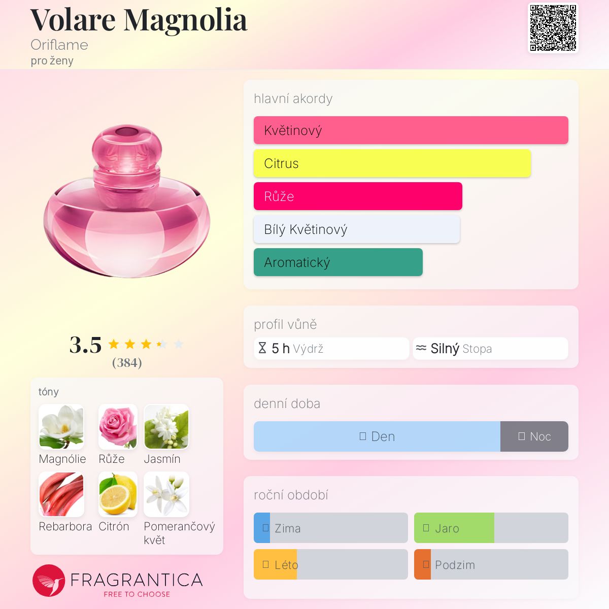 Volare Magnolia podle Oriflame je Floral vůně pro ženy. Volare Magnolia byl/a uveden/a v roce 2010. "Nosem" za touto vůní je Maurice Roucel. Vrchní tóny jsou Rebarbora, Citrón, Pomerančový květ a Citrusy; střední tóny jsouMagnólie, Růže a Jasmín ; základní tóny jsou Fazole tonka, Dřevité tóny a Pižmo.