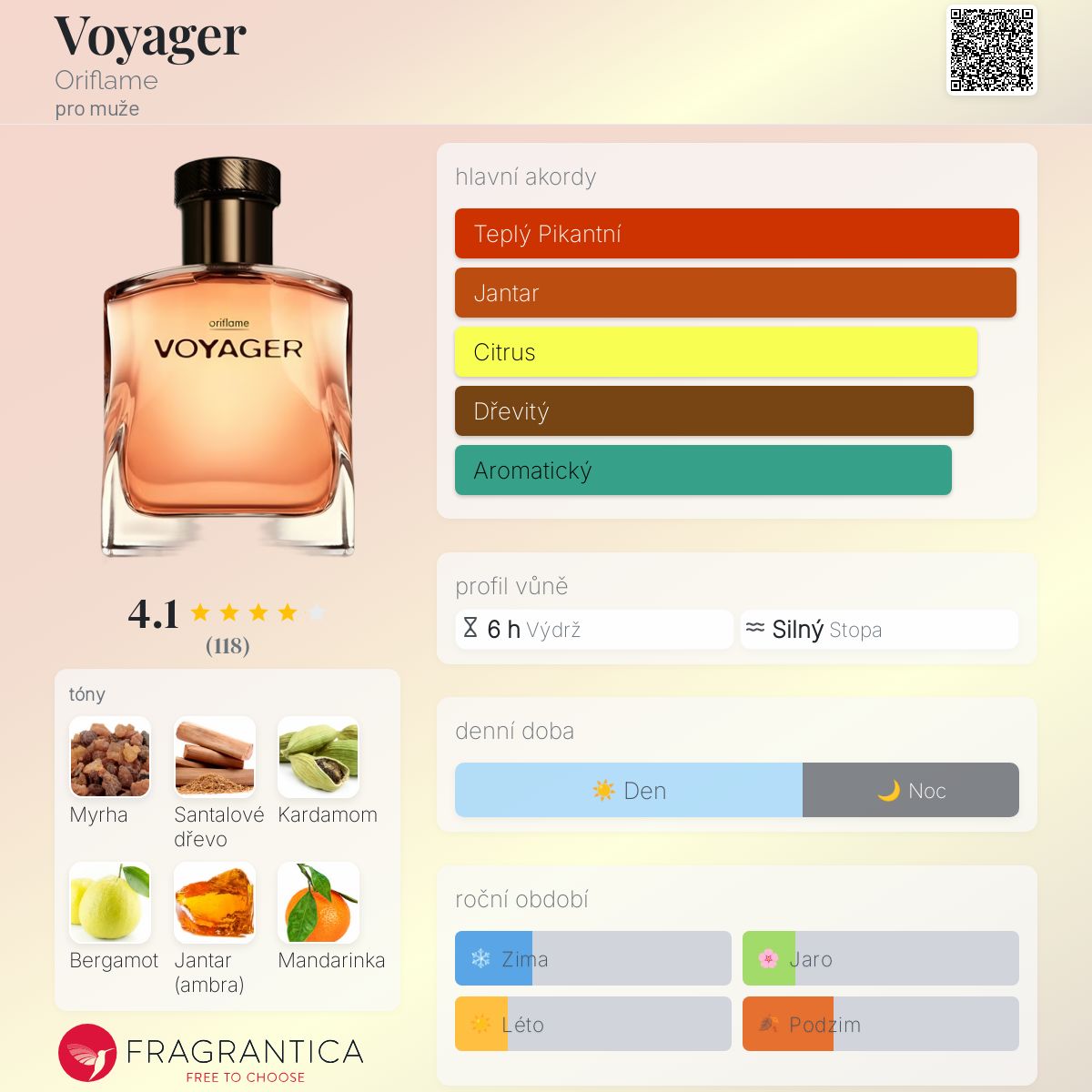 Voyager podle Oriflame je Orientální Spicy vůně pro muže. Voyager byl/a uveden/a v roce 2011. "Nosem" za touto vůní je Philippe Bousseton. Vrchní tóny jsou Bergamot a Mandarinka; střední tóny jsouMyrha, Kardamom a Čaj ; základní tóny jsou Santalové dřevo, Jantar (ambra) a Vetiver.