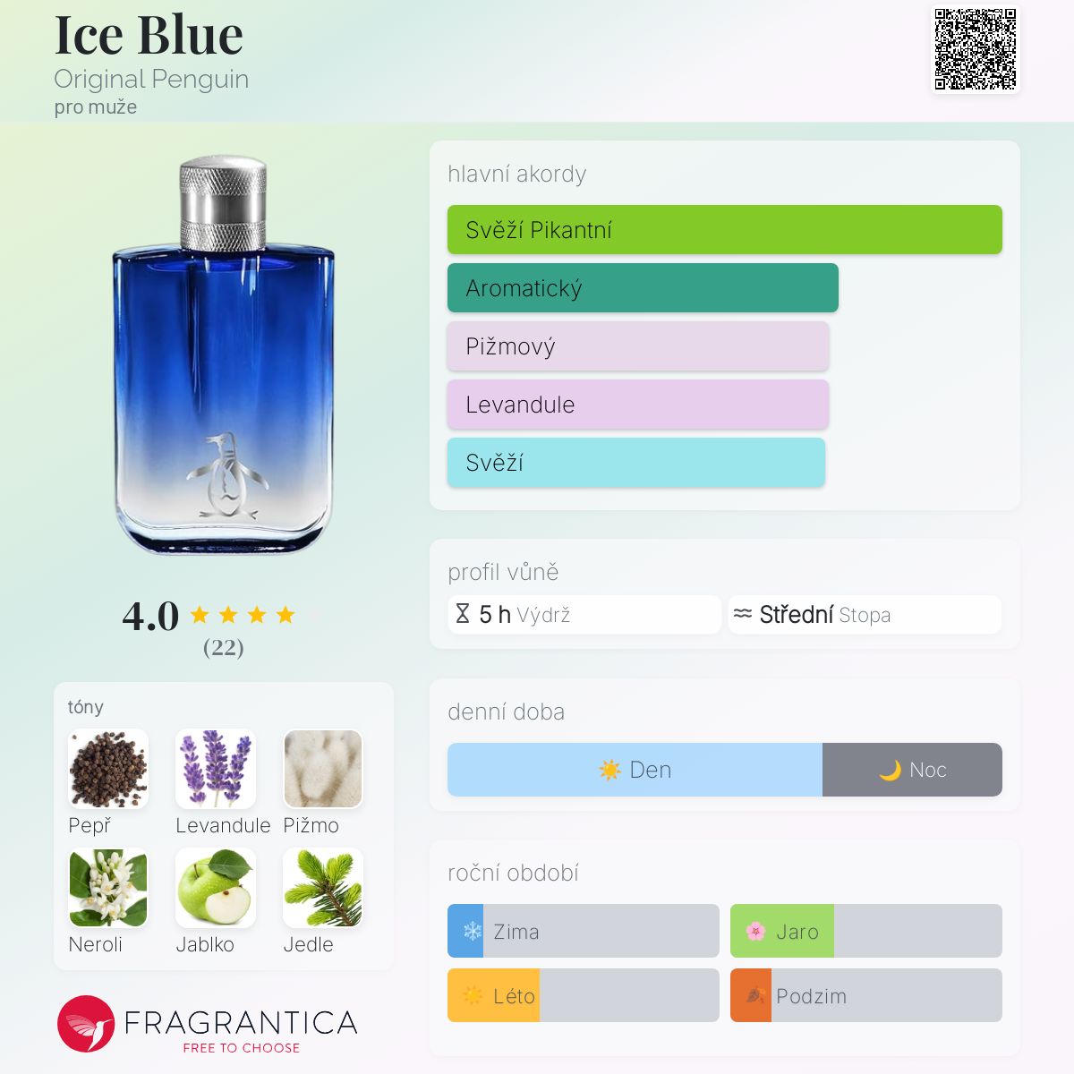 Ice Blue podle Original Penguin je vůně pro muže. Ice Blue byl/a uveden/a v roce 2011. Vrchní tóny jsou Neroli a Jablko; střední tóny jsouČerný pepř, Levandule a Jedle ; základní tóny jsou Pižmo, Pačuli a Vanilka.