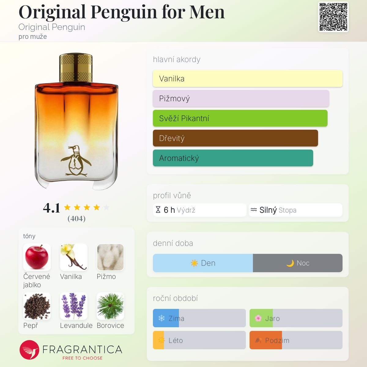 Original Penguin for Men podle Original Penguin je Woody Aromatic vůně pro muže. Original Penguin for Men byl/a uveden/a v roce 2011. Vrchní tóny jsou Červené jablko a Neroli; střední tóny jsouPepř, Levandule a Borovice ; základní tóny jsou Vanilka, Pižmo a Pačuli.