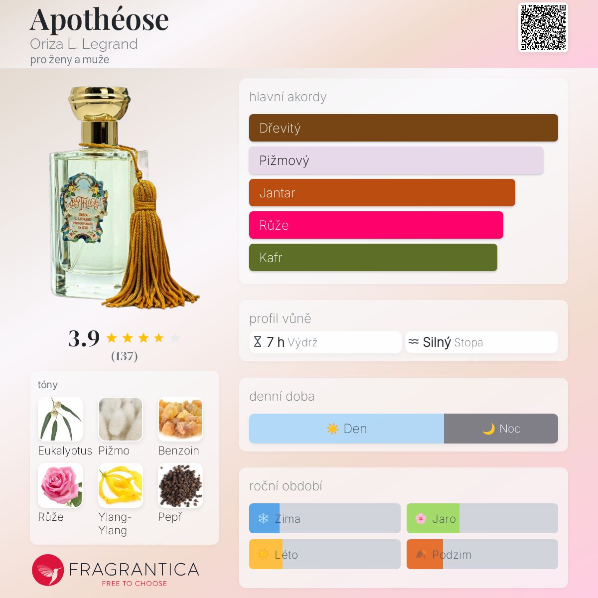 Apothéose podle Oriza L. Legrand je Aromatic Spicy vůně pro ženy a muže. Apothéose byl/a uveden/a v roce 2023. Vrchní tóny jsou Eukalyptus a Pepř; střední tóny jsouRůže a Ylang-Ylang ; základní tóny jsou Pižmo a Benzoin.