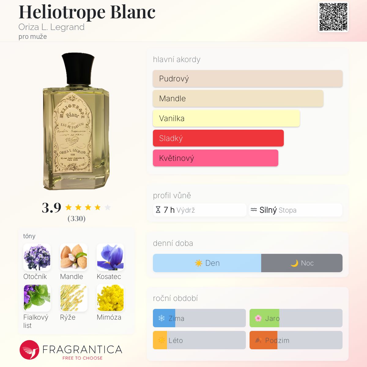 Heliotrope Blanc podle Oriza L. Legrand je Floral vůně pro muže. Heliotrope Blanc byl/a uveden/a v roce 2014. Vrchní tóny jsou Otočník, Fialkový list a Pomerančový květ; střední tóny jsouOtočník, Mandle, Kosatec a Mimóza ; základní tóny jsou Otočník, Rýže, Pižmo, Fazole tonka a Benzoin.