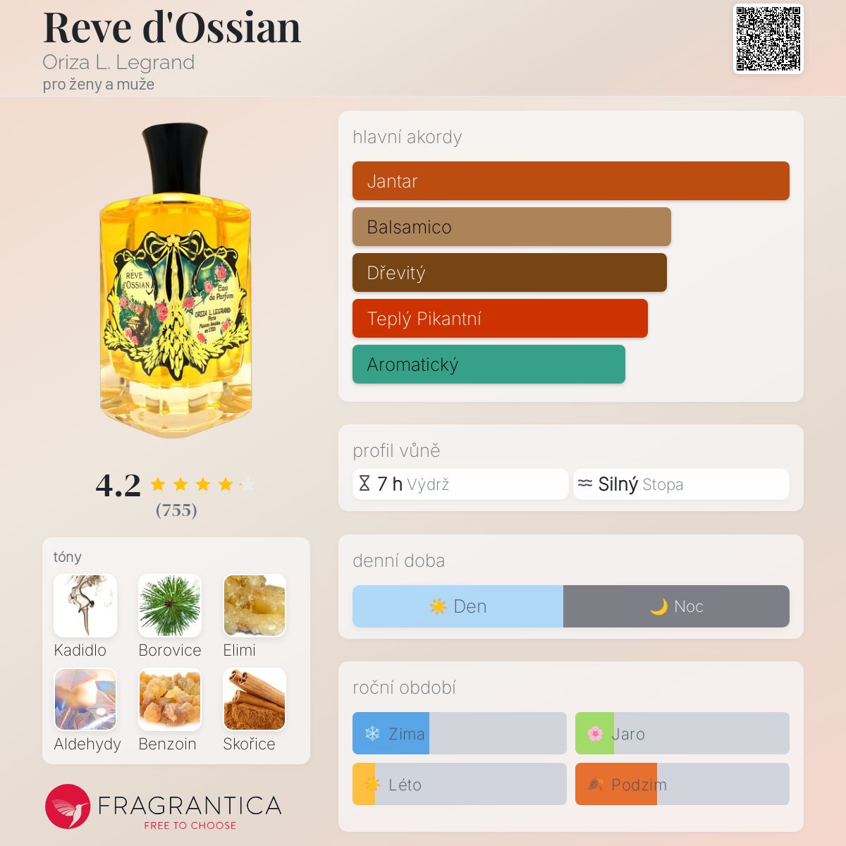 Reve d'Ossian podle Oriza L. Legrand je Orientální Woody vůně pro ženy a muže. Reve d'Ossian byl/a uveden/a v roce 2012. "Nosem" za touto vůní je Hugo Lambert. Vrchní tóny jsou Kadidlo, Borovice a Aldehydy; střední tóny jsouElimi, Benzoin, Skořice, Opoponax, Fazole tonka a Guajakové dřevo ; základní tóny jsou Labdanum, Jantar (ambra), Santalové dřevo, Pižmo a Kůže.