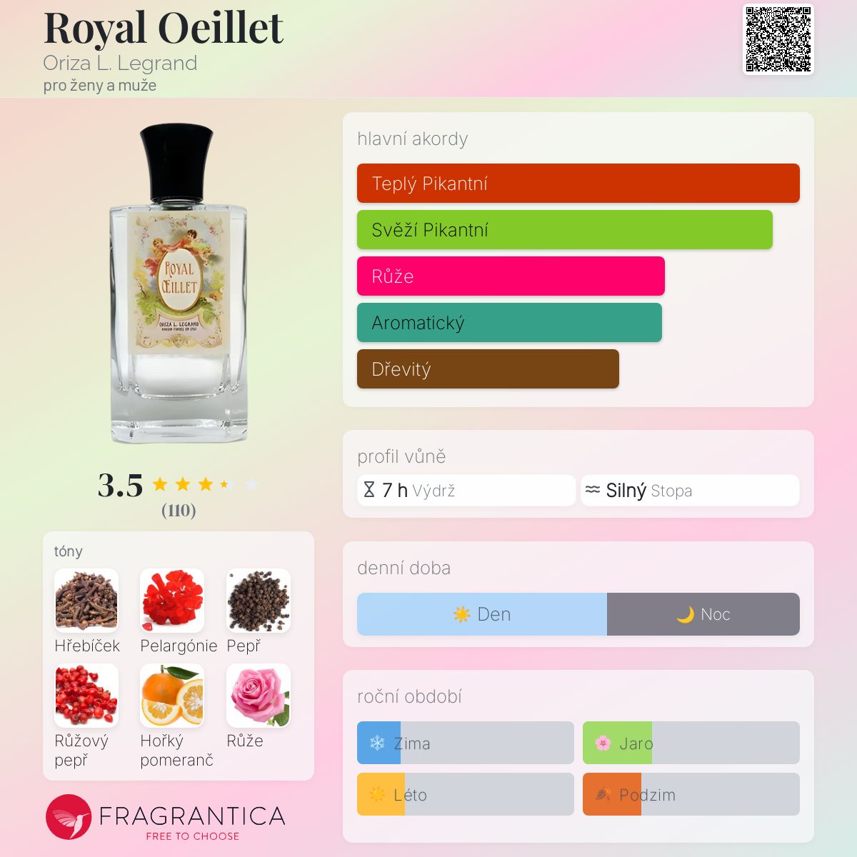 Royal Oeillet podle Oriza L. Legrand je Orientální Spicy vůně pro ženy a muže. Royal Oeillet byl/a uveden/a v roce 2014. Vrchní tóny jsou Černý pepř, Růže a Myrha; střední tóny jsouHřebíček, Pelargónie, Růžový pepř a Cedr ; základní tóny jsou Černý pepř, Hořký pomeranč, Fialkový list a Santalové dřevo.