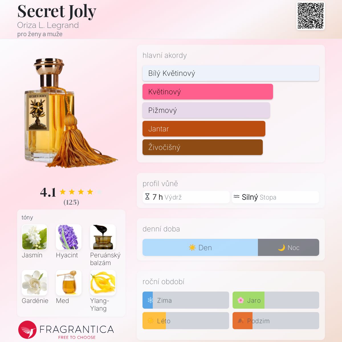 Secret Joly podle Oriza L. Legrand je Floral vůně pro ženy a muže. Secret Joly byl/a uveden/a v roce 2020. Vrchní tóny jsou Jasmín a Hyacint; střední tóny jsouJasmín Sambac, Gardénie, Ylang-Ylang a Tuberóza ; základní tóny jsou Peruánský balzám, Med, Cibetka, Pižmo, Tabák a Benzoin.