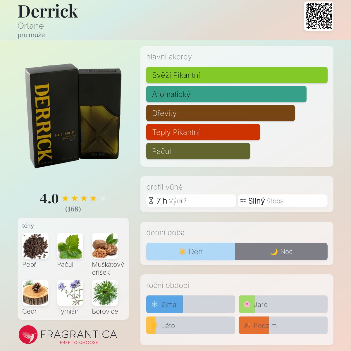 Derrick podle Orlane je Aromatic Fougere vůně pro muže. Derrick byl/a uveden/a v roce 1978. Vrchní tóny jsou Tymián, Levandule, Estragon a Rozmarýn; střední tóny jsouPepř, Pačuli, Muškátový oříšek, Cedr, Borovice, Kmín, Pelargónie a Jasmín ; základní tóny jsou Kadidlo, Labdanum, Bílé pižmo a Kumarin.