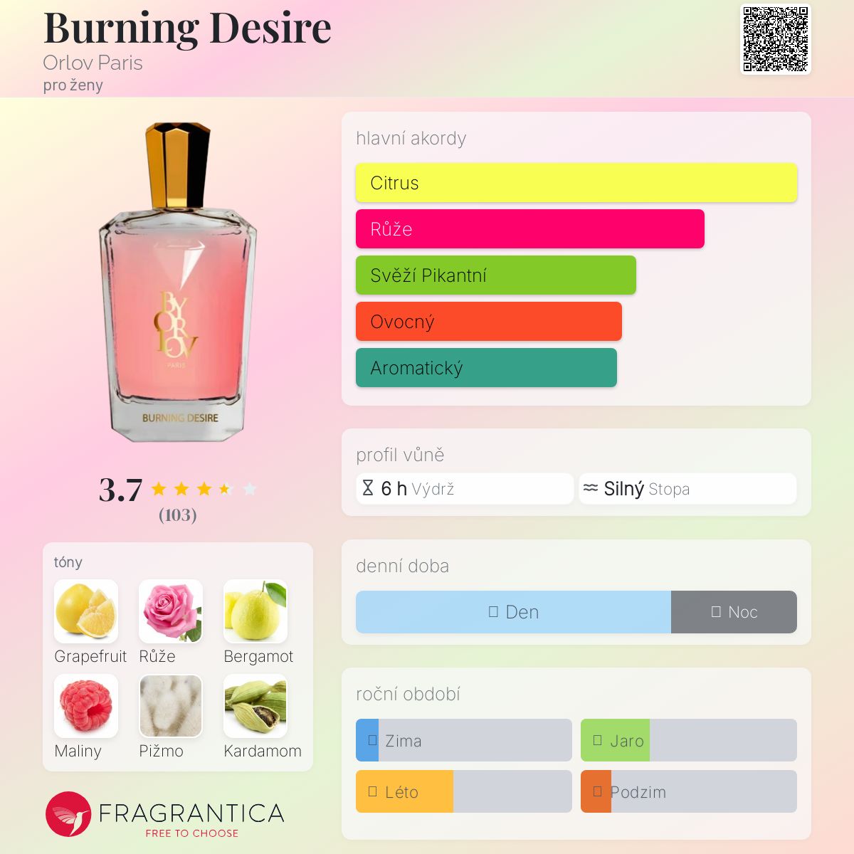 Burning Desire podle Orlov Paris je Floral vůně pro ženy. Burning Desire byl/a uveden/a v roce 2020. "Nosem" za touto vůní je Shyamala Maisondieu. Vrchní tóny jsou Grapefruit, Bergamot, Kardamom a Černý pepř; střední tóny jsouRůže a Maliny ; základní tón je Pižmo.