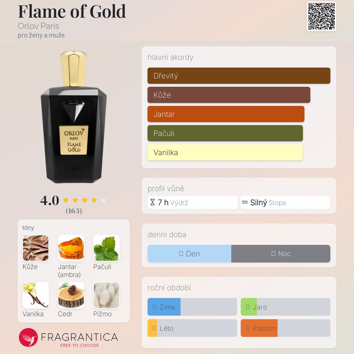 Flame of Gold podle Orlov Paris je Orientální Woody vůně pro ženy a muže. Flame of Gold byl/a uveden/a v roce 2015. "Nosem" za touto vůní je Dominique Ropion. Vrchní tóny jsou Jantar (ambra) a Pižmo; střední tóny jsouPačuli a Virginský cedr ; základní tóny jsou Kůže a Vanilka.