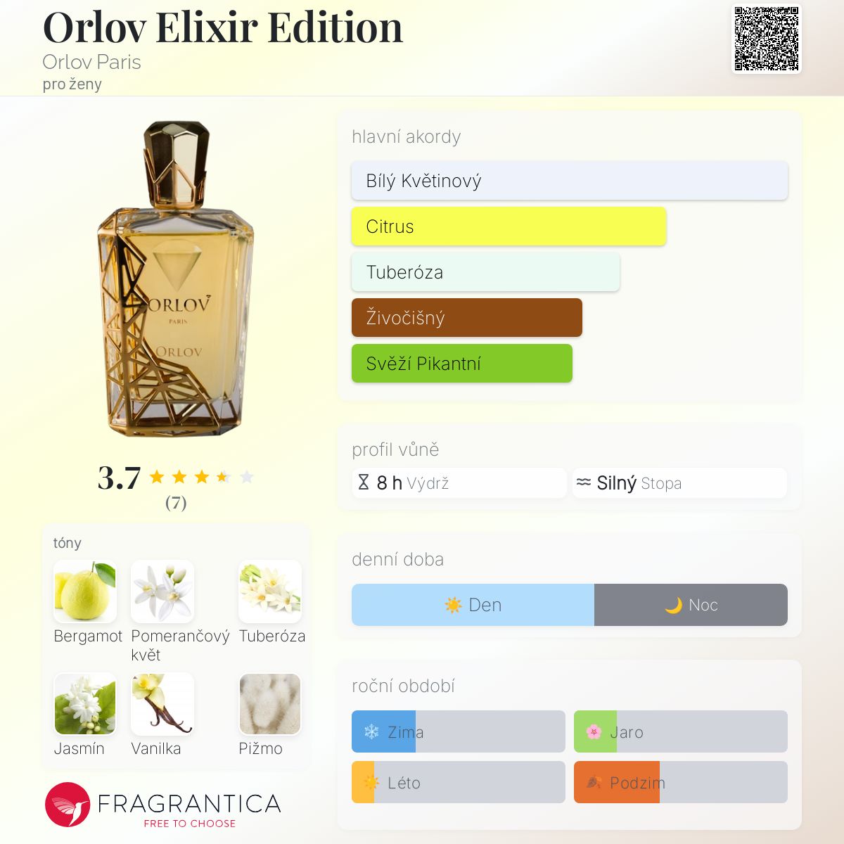 Orlov Elixir Edition podle Orlov Paris je Floral vůně pro ženy. Orlov Elixir Edition byl/a uveden/a v roce 2015. "Nosem" za touto vůní je Dominique Ropion. Vrchní tón je Bergamot ; střední tóny jsouPomerančový květ, Tuberóza a Jasmín Sambac ; základní tóny jsou Vanilka a Pižmo.