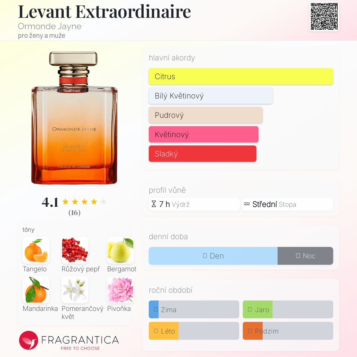 Levant Extraordinaire podle Ormonde Jayne je Floral Fruity vůně pro ženy a muže. Levant Extraordinaire byl/a uveden/a v roce 2023. Vrchní tóny jsou Tangelo, Růžový pepř, Bergamot a Mandarinka; střední tóny jsouPomerančový květ, Pivoňka a Jasmín ; základní tóny jsou Pudrové tóny, Pižmo, Cedr a Jantar (ambra).