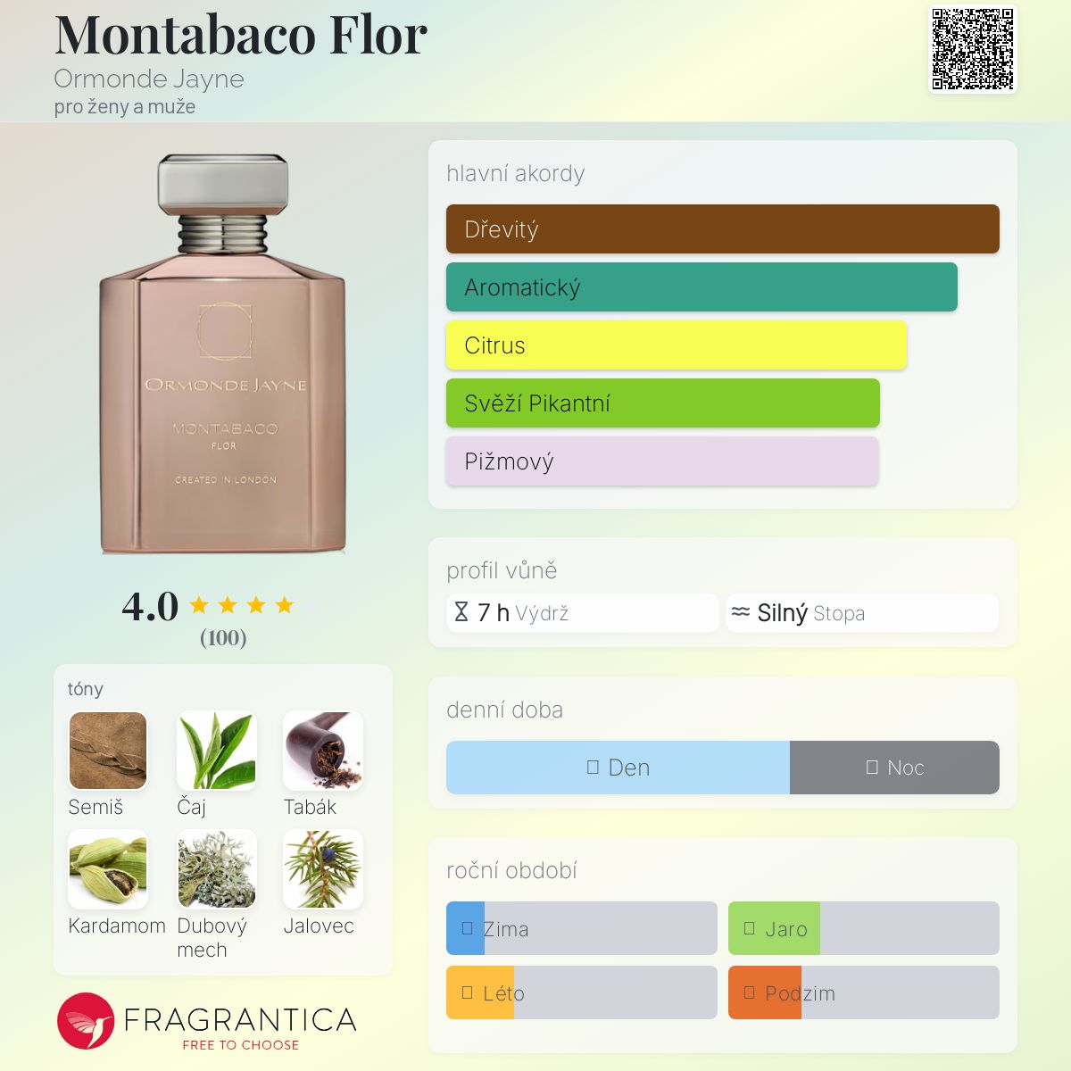 Montabaco Flor podle Ormonde Jayne je Floral vůně pro ženy a muže. Toto je nová vůně. Montabaco Flor byl/a uveden/a v roce 2024. Vrchní tóny jsou Kardamom, Jalovec, Pomeranč, Bergamot a Šalvěj muškátová; střední tóny jsouČaj, Jasmín, Růže, Frézie, Gardénie, Fialka, Leknín a Ylang-Ylang ; základní tóny jsou Semiš, Tabákový list, Mech, Iso E Super, Ambra, Santalové dřevo a Fazole tonka.