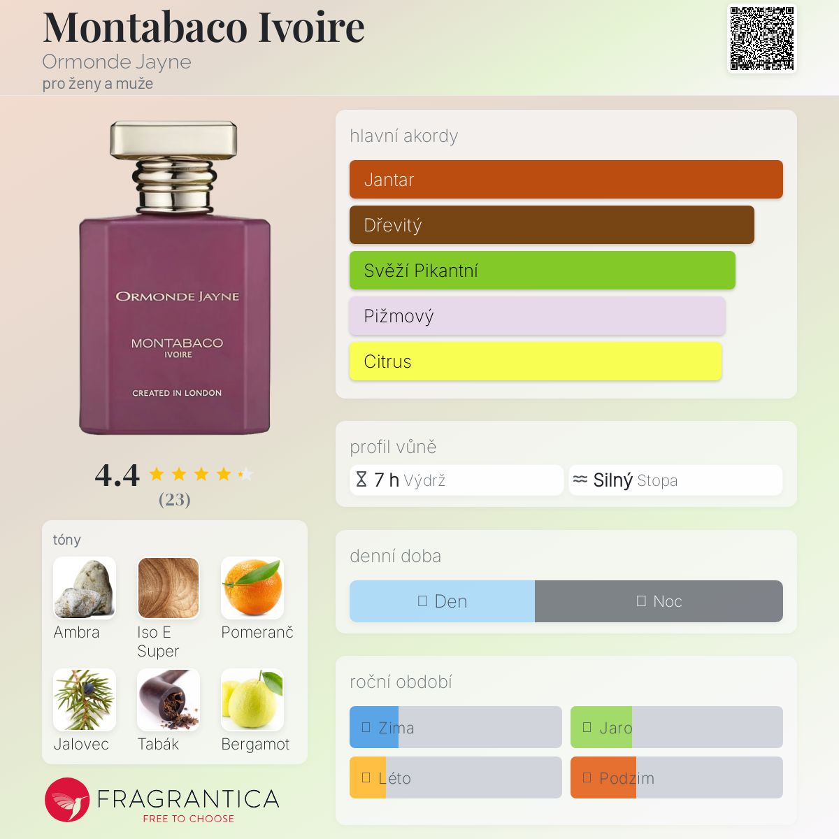 Montabaco Ivoire podle Ormonde Jayne je Orientální Woody vůně pro ženy a muže. Montabaco Ivoire byl/a uveden/a v roce 2022. Vrchní tóny jsou Pomeranč, Jalovec, Bergamot, Sirup z černého rybízu a Černý pepř; střední tóny jsouČaj, Magnólie a Pelargónie ; základní tóny jsou Ambra, Iso E Super, Tabák, Semiš, Pižmo, Pačuli a Fazole tonka.