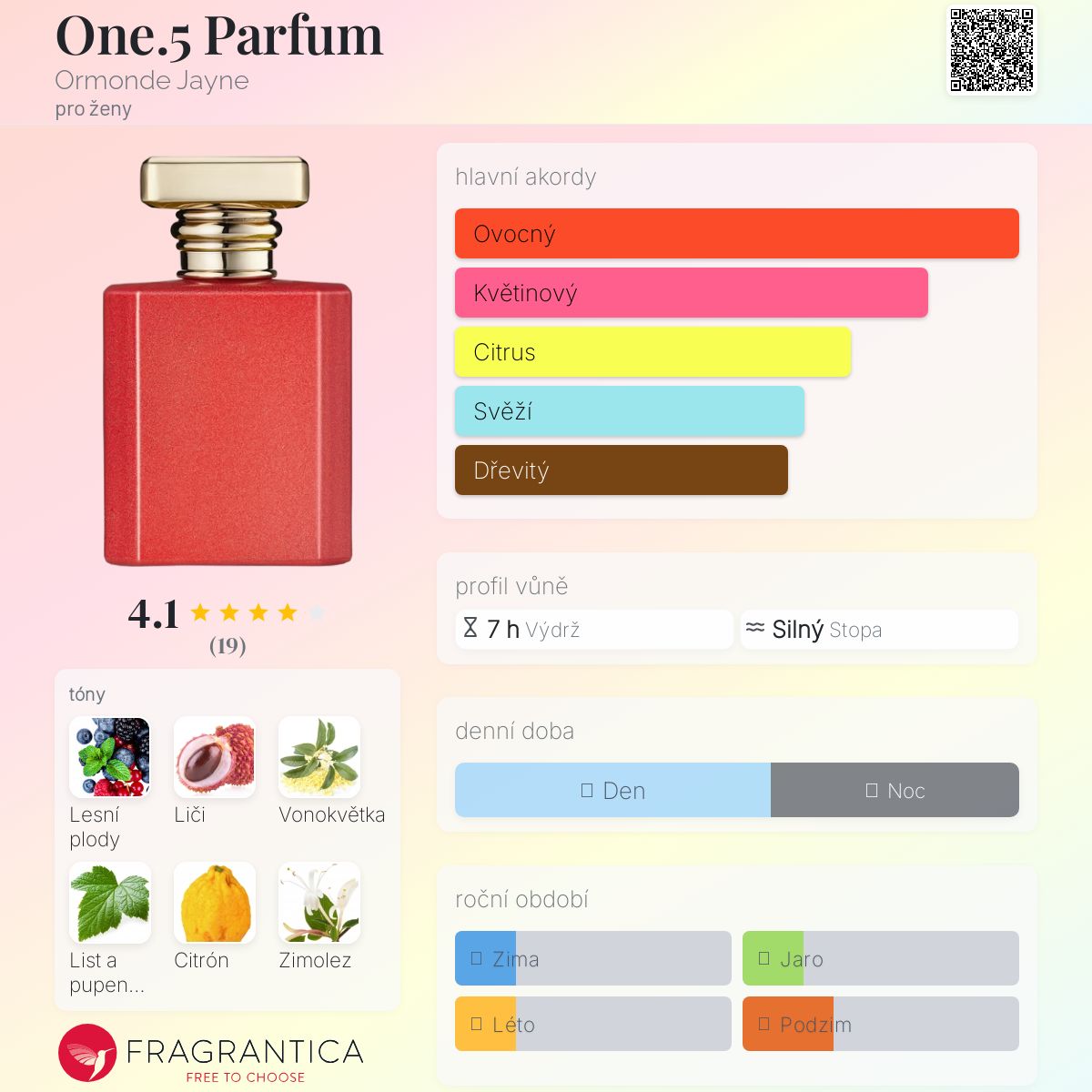 One.5 Parfum podle Ormonde Jayne je Floral Fruity vůně pro ženy. One.5 Parfum byl/a uveden/a v roce 2017. Vrchní tóny jsou Lesní plody, Liči, Černý rybíz, Citrón a Mandarinka; střední tóny jsouVonokvětka, Zimolez, Frézie, Leknín a Magnólie ; základní tóny jsou Vanilka, Jantar (ambra), Pižmo a Santalové dřevo.