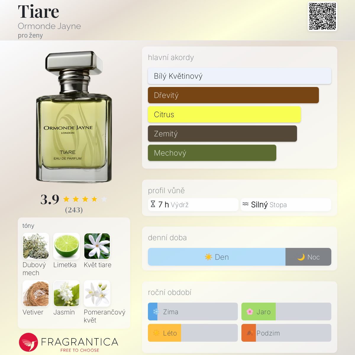 Tiare podle Ormonde Jayne je Floral vůně pro ženy. Tiare byl/a uveden/a v roce 2009. "Nosem" za touto vůní je Geza Schoen. Vrchní tóny jsou Limetka, Květ afrického pomeranče a Mandarinka; střední tóny jsouKvět tiare, Jasmín, Leknín, Orris, Frézie a Ylang-Ylang ; základní tóny jsou Dubový mech, Vetiver, Virginský cedr, Pačuli, Pižmo a Santalové dřevo.