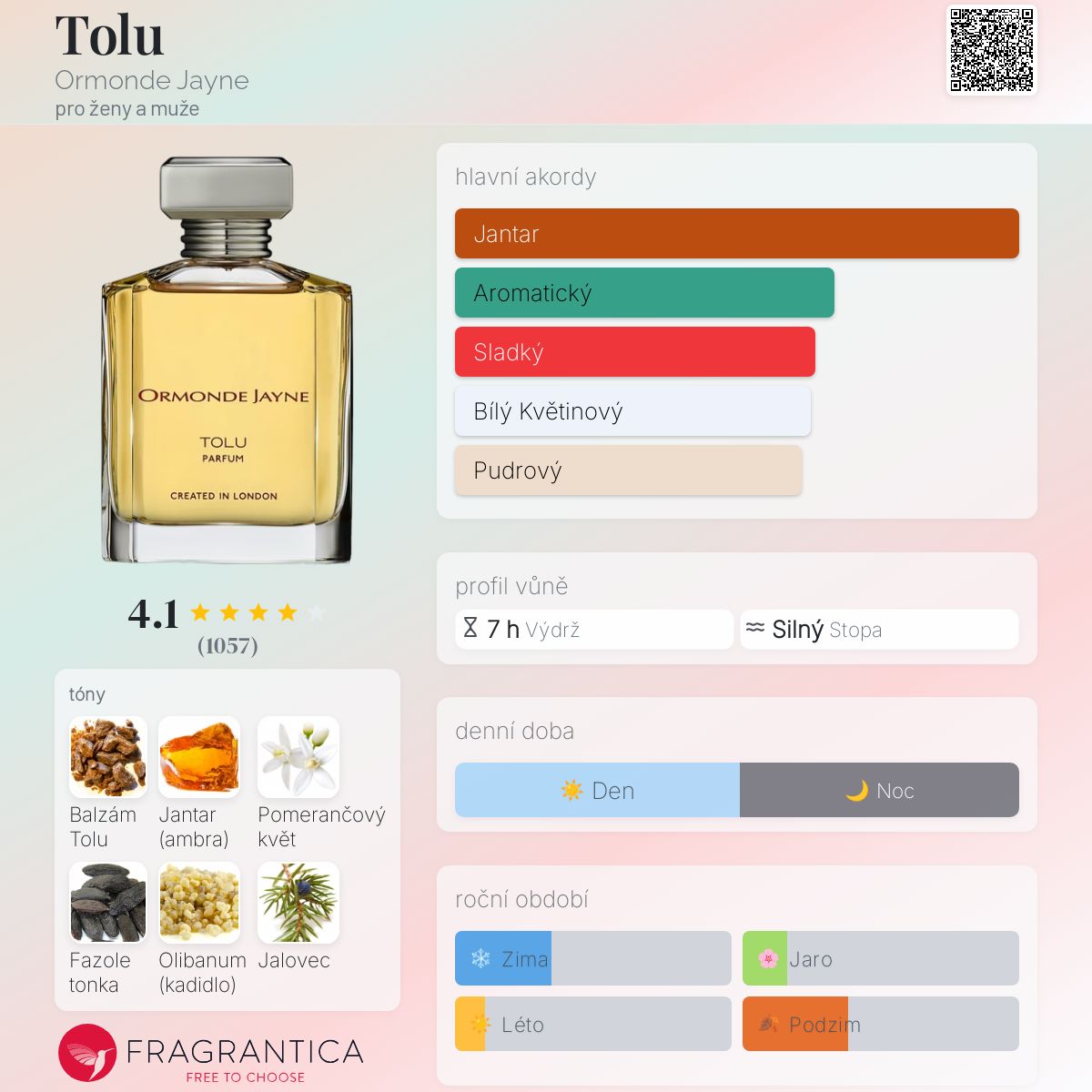 Tolu podle Ormonde Jayne je Orientální Woody vůně pro ženy a muže. Tolu byl/a uveden/a v roce 2002. "Nosem" za touto vůní je Geza Schoen. Vrchní tóny jsou Pomerančový květ, Jalovec a Šalvěj muškátová; střední tóny jsouOrchidej, Růže a Konvalinka ; základní tóny jsou Balzám Tolu, Jantar (ambra), Fazole tonka a Olibanum.