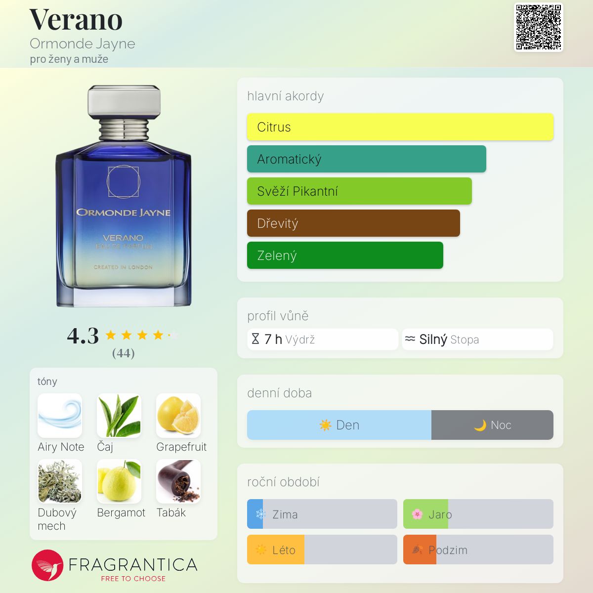 Verano podle Ormonde Jayne je Woody Aromatic vůně pro ženy a muže. Toto je nová vůně. Verano byl/a uveden/a v roce 2025. "Nosem" za touto vůní je Geza Schoen. Vrchní tóny jsou Airy Note, Grapefruit, Bergamot, Šalvěj muškátová, Jalovec, Pomeranč a Kardamom; střední tóny jsouČaj, Fialka, Růže a Magnólie ; základní tóny jsou Mech, Tabákový list, Ambra, Iso E Super, Santalové dřevo, Kašmír, Semiš a Fazole tonka.
