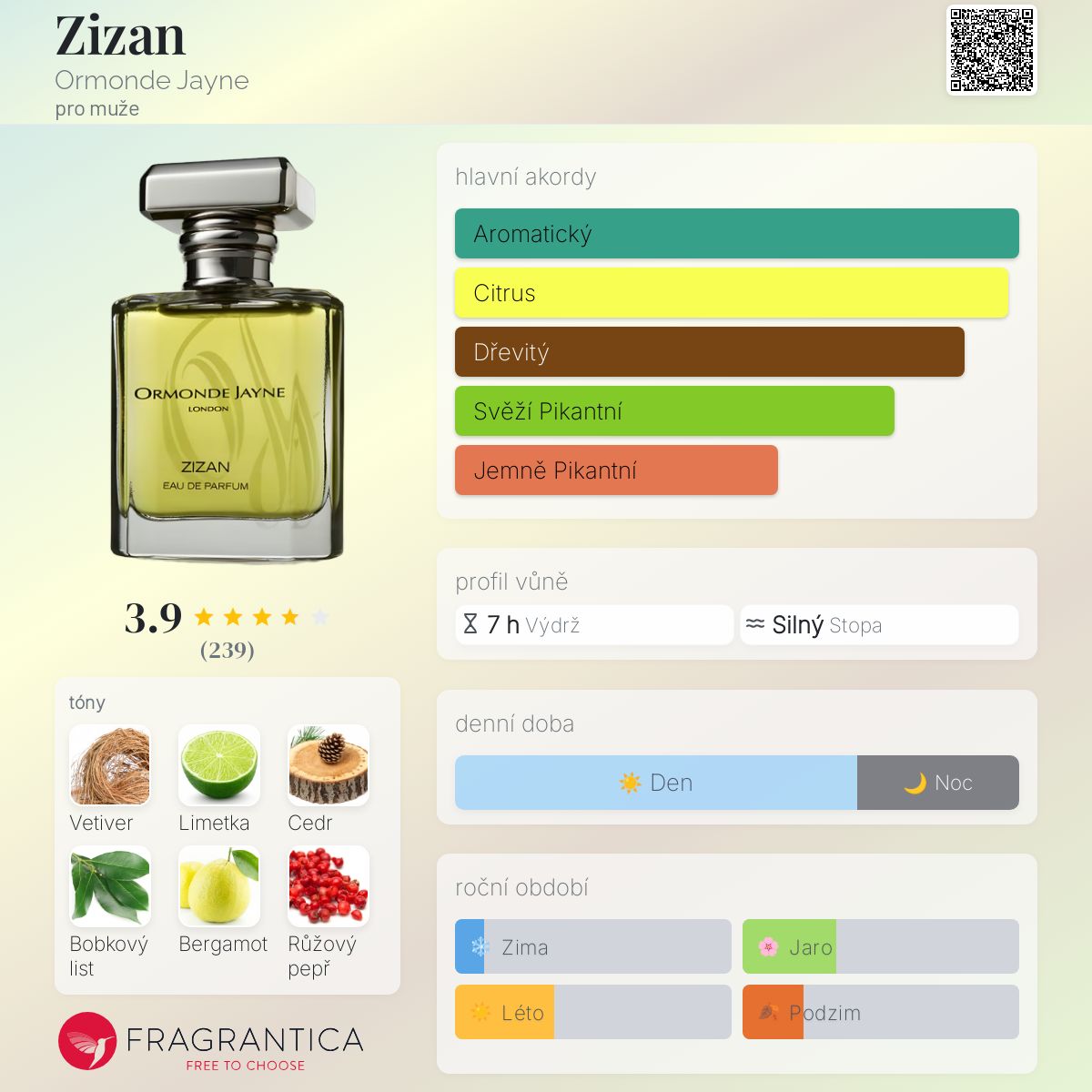 Zizan podle Ormonde Jayne je Citrus Aromatic vůně pro muže. Zizan byl/a uveden/a v roce 2008. "Nosem" za touto vůní je Geza Schoen. Vrchní tóny jsou Limetka, Bergamot, Růžový pepř, Citron amalfi , Jalovec a Šalvěj muškátová; střední tóny jsouBobkový list, Jasmín a Fialka ; základní tóny jsou Vetiver, Cedr, Jantar (ambra) a Pižmo.