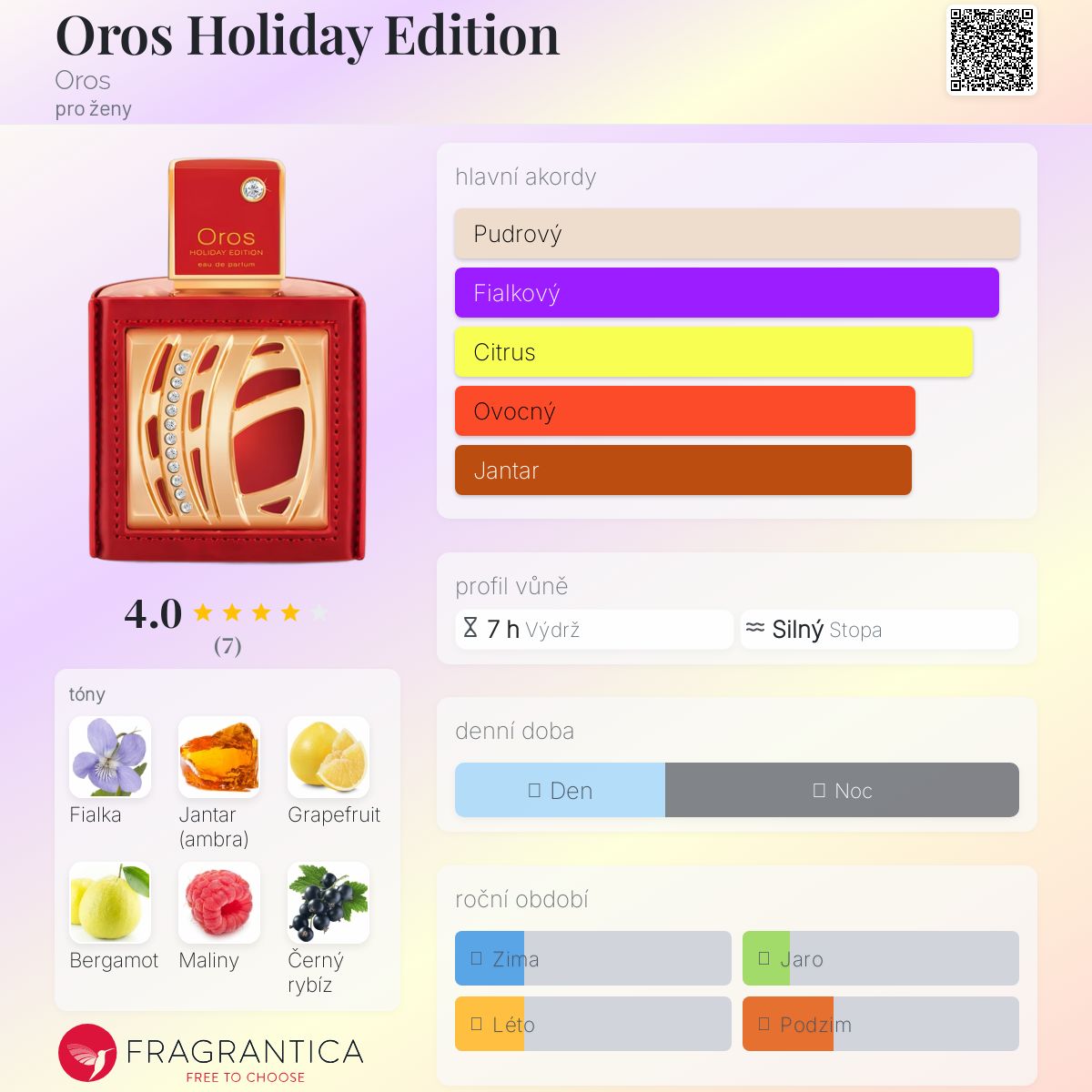 Oros Holiday Edition podle Oros je Orientální Floral vůně pro ženy. Oros Holiday Edition byl/a uveden/a v roce 2015. Vrchní tóny jsou Grapefruit, Bergamot, Maliny, Černý rybíz a Broskev; střední tóny jsouFialka, Cedr, Růže, Jasmín a Skořice ; základní tóny jsou Jantar (ambra), Pižmo a Vanilka.
