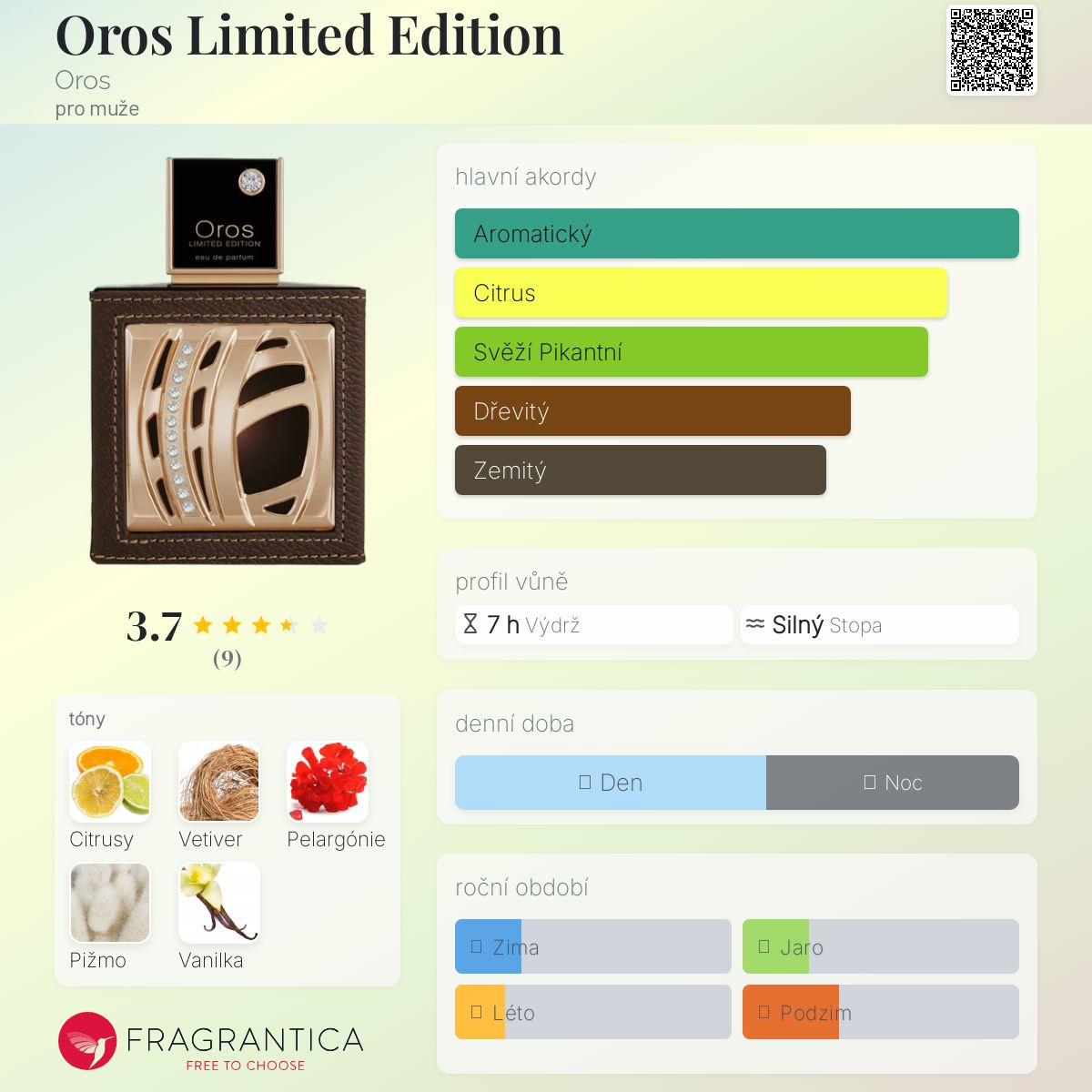 Oros Limited Edition podle Oros je Aromatic vůně pro muže. Oros Limited Edition byla spuštěna během 2014. Vrchní tón je Citrusy ; střední tóny jsouVetiver a Pelargónie ; základní tóny jsou Pižmo a Vanilka.