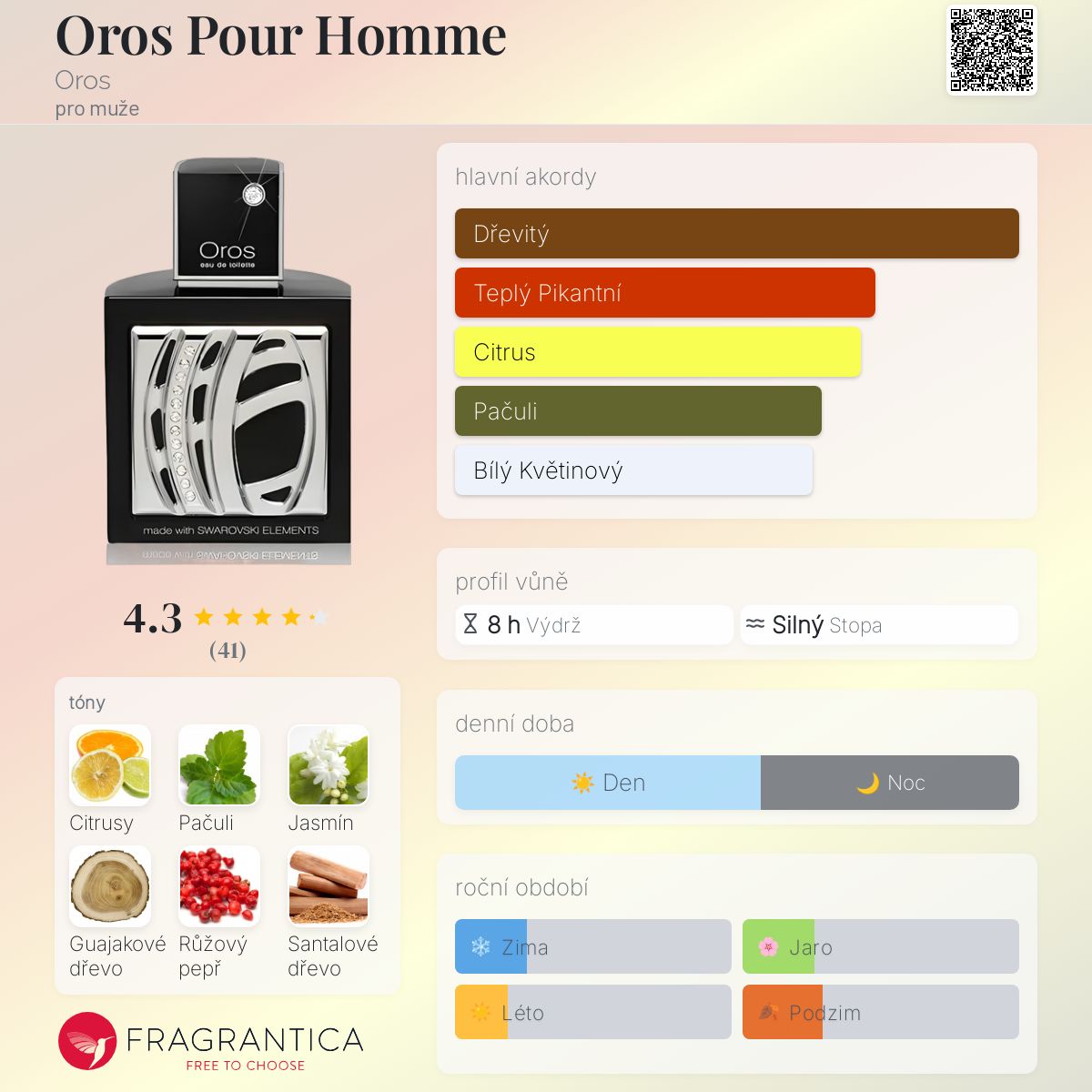 Oros Pour Homme podle Oros je Woody Spicy vůně pro muže. Oros Pour Homme byl/a uveden/a v roce 2014. Vrchní tóny jsou Citrusy a Růžový pepř; střední tóny jsouJasmín a Koření ; základní tóny jsou Pačuli, Guajakové dřevo a Santalové dřevo.