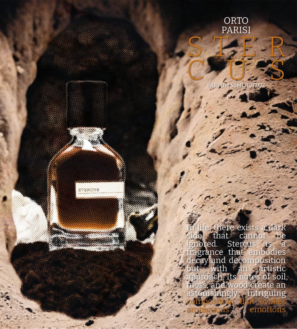 Stercus podle Orto Parisi je Woody Floral Musk vůně pro ženy a muže. Stercus byl/a uveden/a v roce 2014. "Nosem" za touto vůní je Alessandro Gualtieri. Vrchní tóny jsou Mandle, Aldehydy a Anýz; střední tón jeRůže ; základní tóny jsou Agarové dřevo (oud), Pižmo, Kůže, Vanilka, Cedr a Otočník.