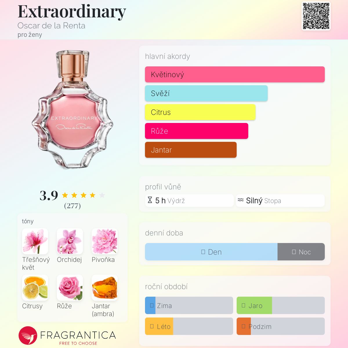 Extraordinary podle Oscar de la Renta je Floral vůně pro ženy. Extraordinary byl/a uveden/a v roce 2015. Extraordinary byl/a vytvořen/a Pascal Gaurin a Bruno Jovanovic. Vrchní tóny jsou Třešňový květ, Citrusy a Neroli; střední tóny jsouPivoňka, Růže a Magnólie ; základní tóny jsou Vanilková orchidej, Jantar (ambra) a Dřevité tóny.