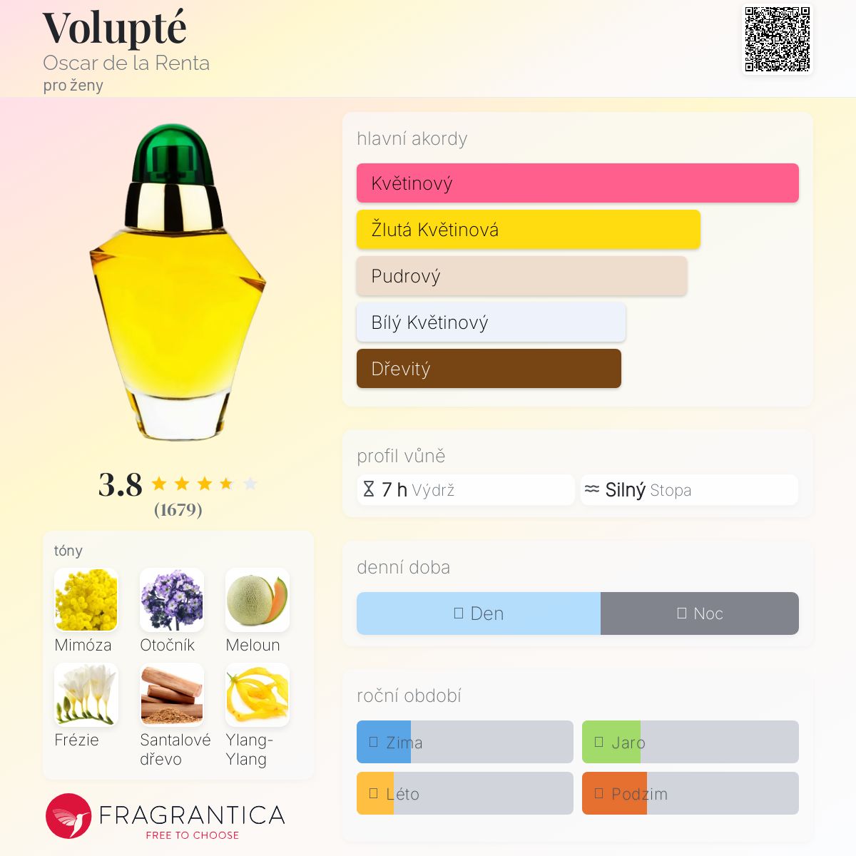 Volupté podle Oscar de la Renta je Floral Green vůně pro ženy. Volupté byl/a uveden/a v roce 1992. Volupté byl/a vytvořen/a Sophia Grojsman a Nicholas Calderone. Vrchní tóny jsou Mimóza, Meloun, Frézie, Vonokvětka, Mandarinka, Vodní meloun a Brambořík; střední tóny jsouOtočník, Ylang-Ylang, Narcis, Karafiát, Jasmín, Konvalinka, Lotus a Pivoňka ; základní tóny jsou Santalové dřevo, Jantar (ambra), Kadidlo, Tuberóza, Vanilka a Pačuli.