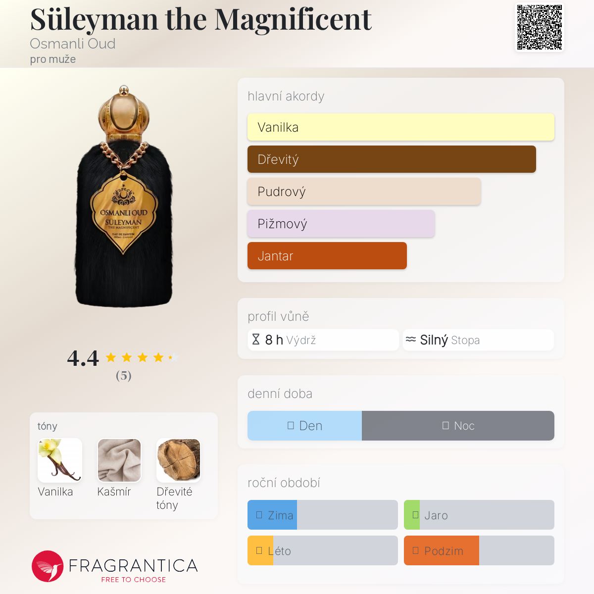 Süleyman the Magnificent podle Osmanli Oud je vůně pro muže. Vrchní tón je Vanilka ; střední tón jeKašmír ; základní tón je Dřevité tóny.