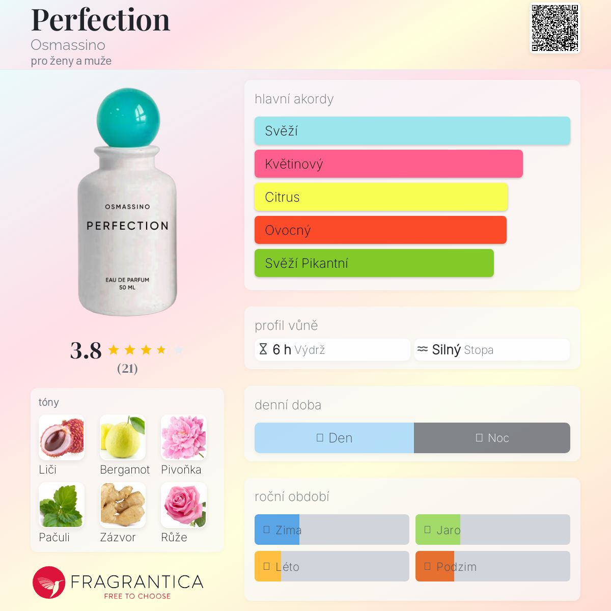 Perfection podle Osmassino je Orientální Floral vůně pro ženy a muže. Perfection byl/a uveden/a v roce 2024. Vrchní tóny jsou Liči, Bergamot a Zázvor; střední tóny jsouPivoňka, Turecká růže a Kakao ; základní tón je Pačuli.