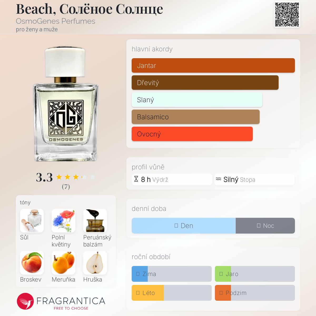 Beach, Солёное Солнце podle OsmoGenes Perfumes je vůně pro ženy a muže. Beach, Солёное Солнце byl/a uveden/a v roce 2021. "Nosem" za touto vůní je Olga Gosina. Vrchní tóny jsou Broskev, Meruňka a Hruška; střední tóny jsouSůl a Polní květiny ; základní tóny jsou Peruánský balzám, Dřevité tóny, Guajakové dřevo, Jantar (ambra) a Styrax.