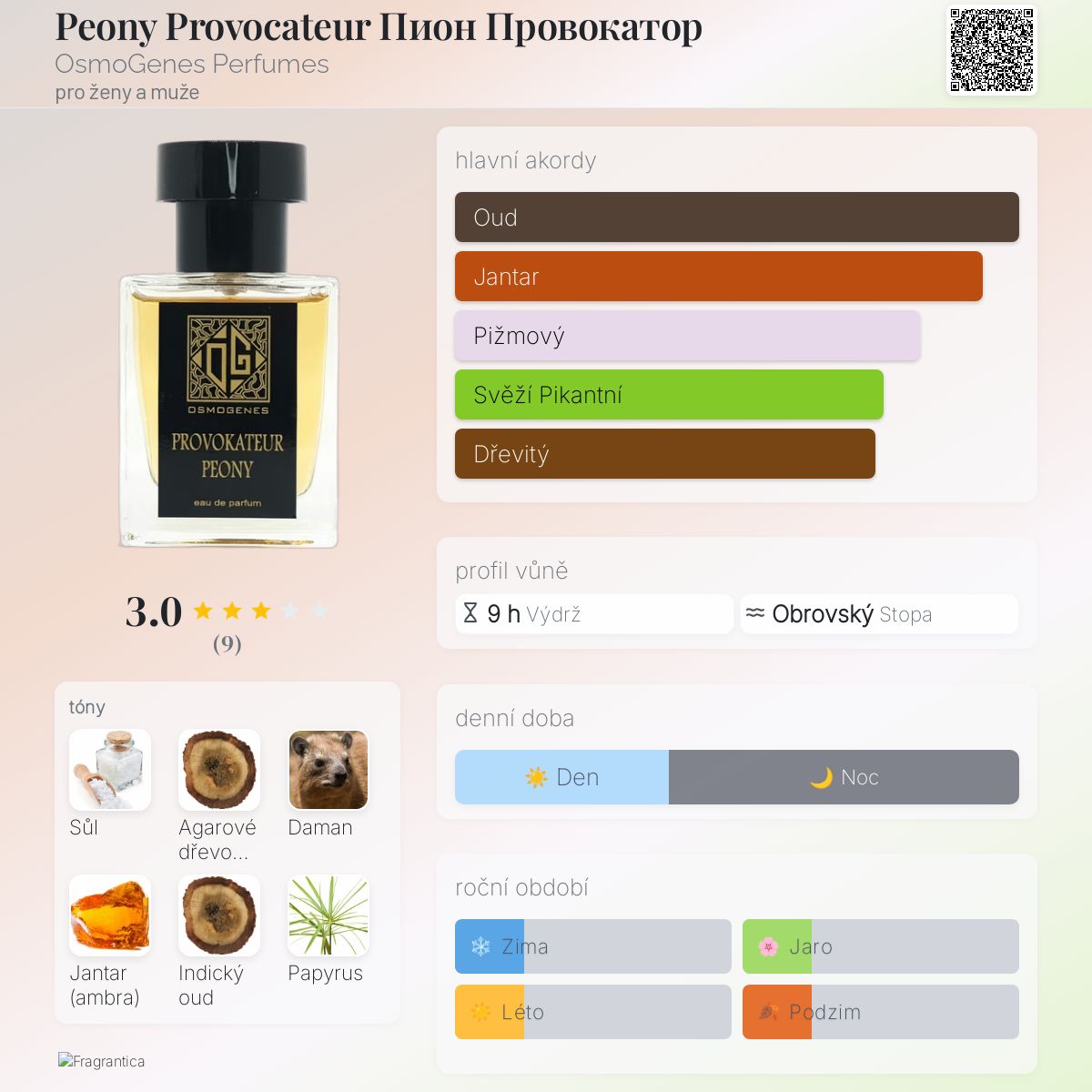 Peony Provocateur Пион Провокатор podle OsmoGenes Perfumes je Orientální Woody vůně pro ženy a muže. Peony Provocateur Пион Провокатор byl/a uveden/a v roce 2017. "Nosem" za touto vůní je Olga Gosina. Vrchní tóny jsou Rajčatový list a Pepř; střední tóny jsouSůl, Agarové dřevo (oud), Pivoňka a Růže ; základní tóny jsou Daman, Jantar (ambra), Indický oud, Papyrus a Kašmírové dřevo.