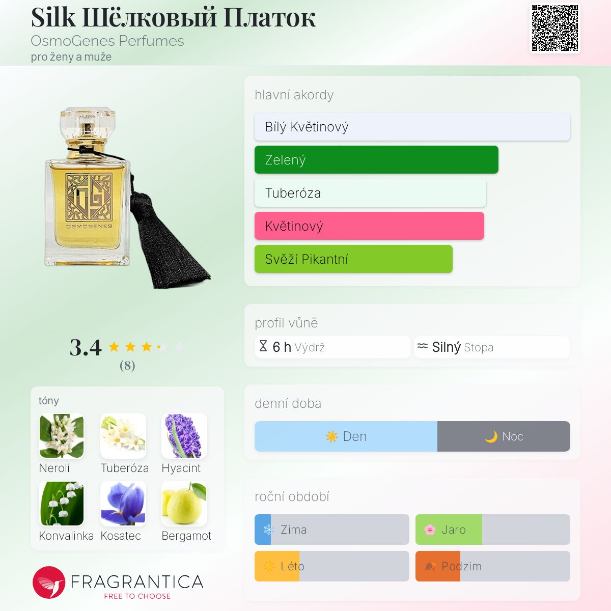 Silk Шёлковый Платок podle OsmoGenes Perfumes je Floral vůně pro ženy a muže. Silk Шёлковый Платок byl/a uveden/a v roce 2019. "Nosem" za touto vůní je Olga Gosina. Vrchní tóny jsou Neroli, Hyacint a Bergamot; střední tóny jsouNeroli, Tuberóza, Konvalinka a Kosatec ; základní tóny jsou Vetiver, Santalové dřevo, Dubový mech, Labdanum, Pačuli a Ambrette (přírodní pižmo).