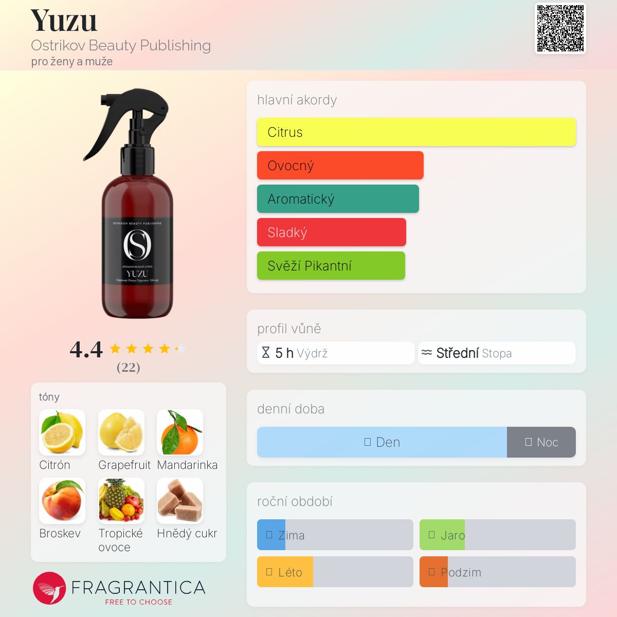 Yuzu podle Ostrikov Beauty Publishing je Citrus vůně pro ženy a muže. Yuzu byl/a uveden/a v roce 2023. "Nosem" za touto vůní je Tetsuya Nagasawa. Vrchní tóny jsou Citronová kůra a Grapefruit; střední tóny jsouMandarinka, Bílá broskev a Tropické ovoce ; základní tóny jsou Hnědý cukr, Černý vanilkový lusk a Pralinka.