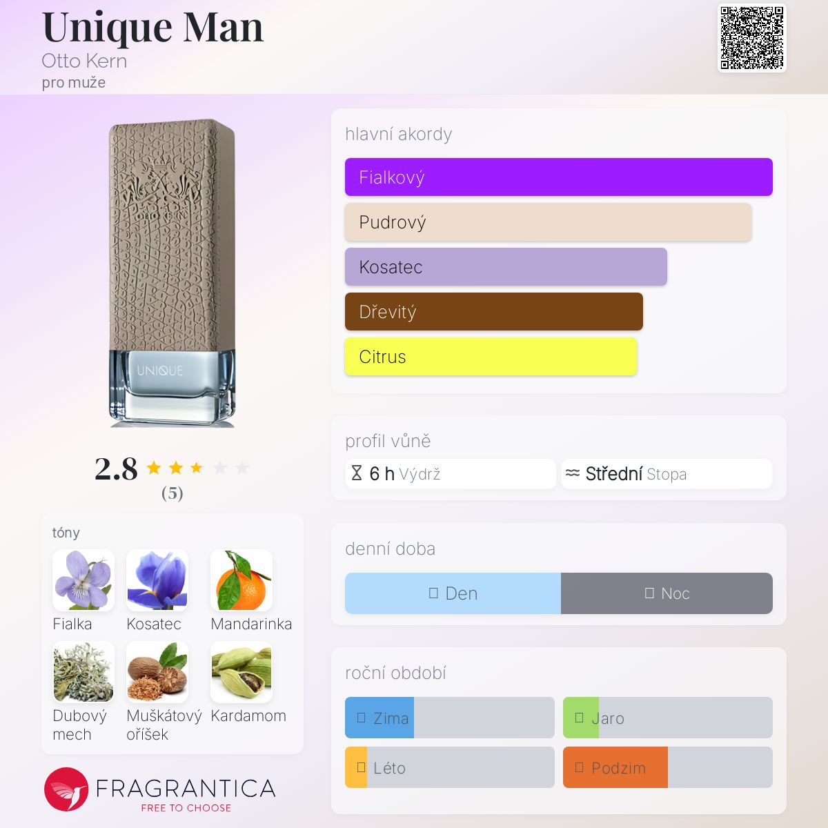 Unique Man podle Otto Kern je Woody Spicy vůně pro muže. Unique Man byl/a uveden/a v roce 2012. Vrchní tóny jsou Mandarinka, Muškátový oříšek a Kardamom; střední tóny jsouFialka, Kosatec a Bazalka ; základní tóny jsou Dubový mech, Vetiver a Santalové dřevo.