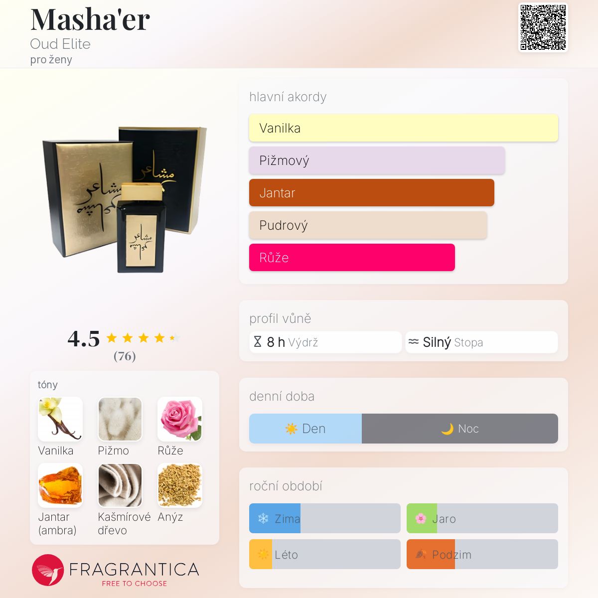 Masha'er podle Oud Elite je Orientální vůně pro ženy. Masha'er byl/a uveden/a v roce 2013. Vrchní tóny jsou Anýz, Olibanum a Bazalka; střední tóny jsouVanilka, Růže a Kašmírové dřevo ; základní tóny jsou Pižmo, Jantar (ambra) a Indický oud.