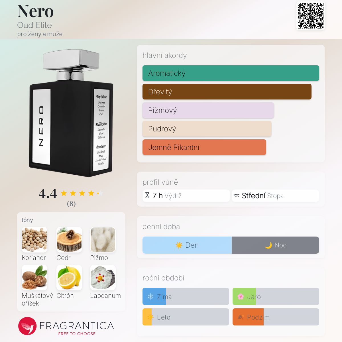 Nero podle Oud Elite je Orientální Woody vůně pro ženy a muže. Nero byla spuštěna během 2010. Vrchní tóny jsou Koriandr, Muškátový oříšek, Citrón a Labdanum; střední tóny jsouCedr, Levandule a Tuberóza ; základní tóny jsou Pižmo, Pačuli, Santalové dřevo a Vanilka.