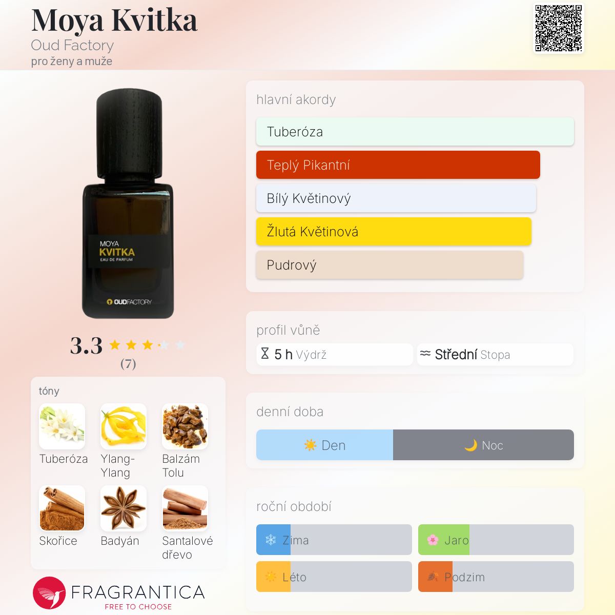 Moya Kvitka podle Oud Factory je Orientální Floral vůně pro ženy a muže. Moya Kvitka byl/a uveden/a v roce 2020. "Nosem" za touto vůní je Xenom.