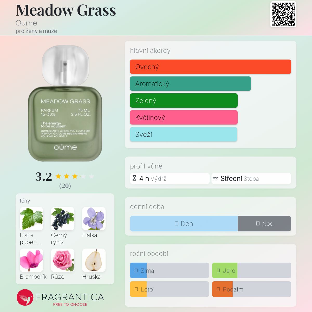 Meadow Grass podle Oume je Floral Fruity vůně pro ženy a muže. Toto je nová vůně. Meadow Grass byl/a uveden/a v roce 2024. "Nosem" za touto vůní je Urs Castelletti. Vrchní tóny jsou Poupata rybízu, Černý rybíz, Bergamot, Mandarinka a Pelargónie; střední tóny jsouFialka, Brambořík, Růže, Hruška a Maliny ; základní tóny jsou Pižmo, Fazole tonka, Santalové dřevo a Vanilka.