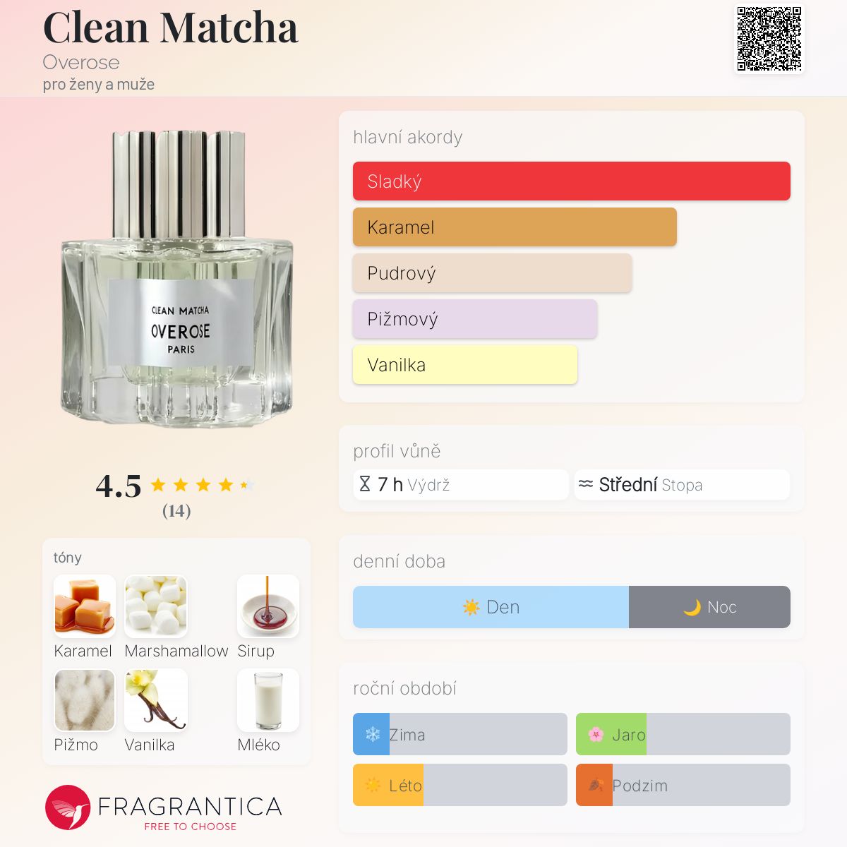 Clean Matcha podle Overose je Orientální Vanilla vůně pro ženy a muže. Toto je nová vůně. Clean Matcha byl/a uveden/a v roce 2025. Vrchní tóny jsou Karamel, Sirup, Hnědý cukr, Prádlo a Matcha čaj; střední tóny jsouMarshamallow, Vanilka, Mléko, Poupata rybízu a Matcha čaj ; základní tóny jsou Pižmo, Mořská sůl a Kůže.