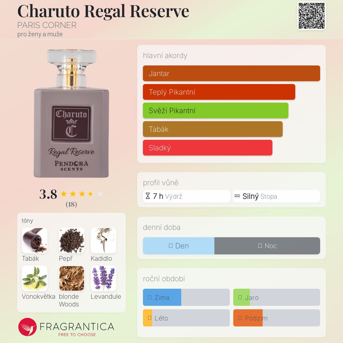Charuto Regal Reserve podle PARIS CORNER je Orientální Fougere vůně pro ženy a muže. Toto je nová vůně. Charuto Regal Reserve byl/a uveden/a v roce 2024. Vrchní tóny jsou Tabák, Černý pepř, Kadidlo a Bergamot; střední tóny jsouVonokvětka, Levandule, Kardamom a Labdanum ; základní tóny jsou Světlá dřeva, Fazole tonka, Vanilka, Jantar (ambra) a Pižmo.