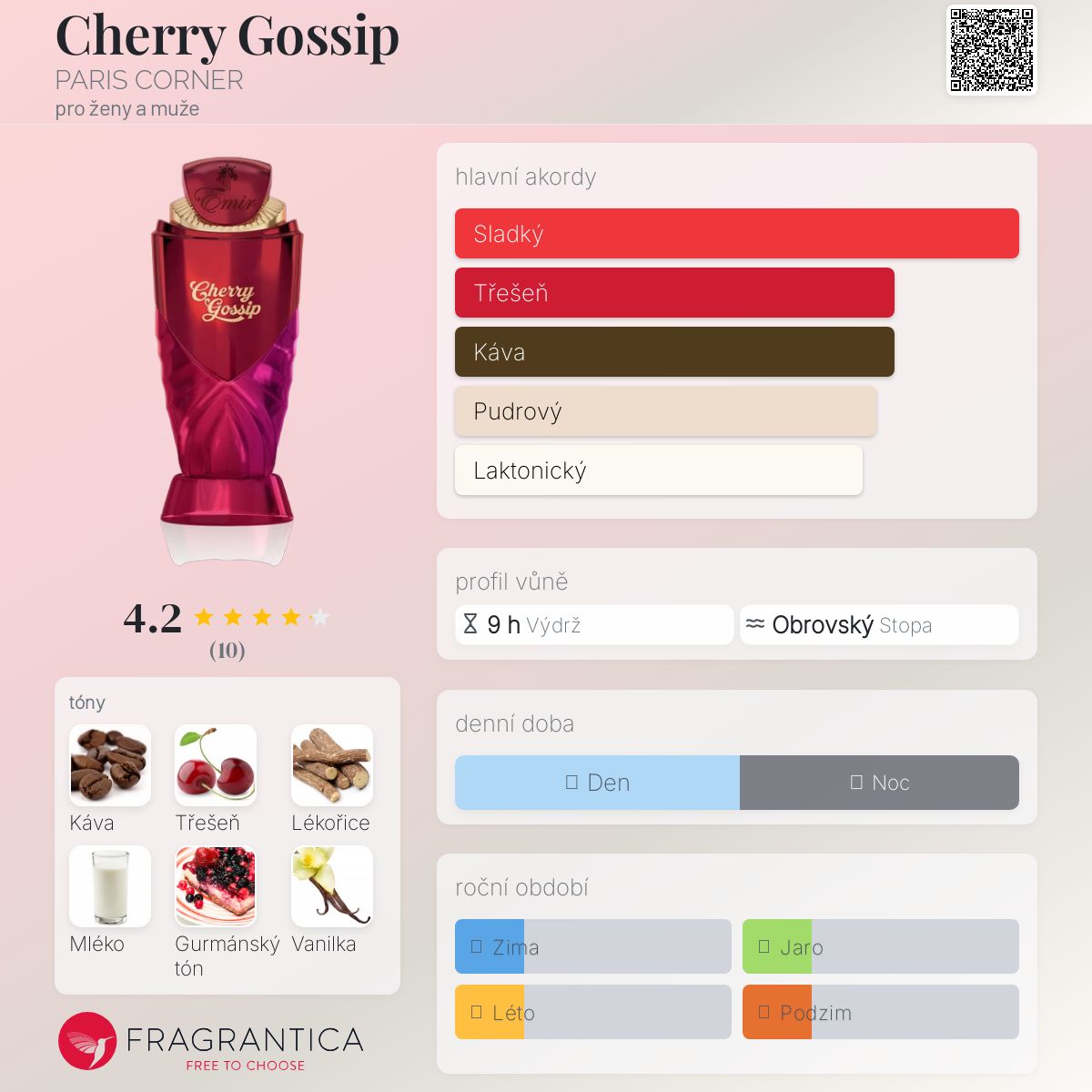 Cherry Gossip podle PARIS CORNER je Orientální Vanilla vůně pro ženy a muže. Toto je nová vůně. Cherry Gossip byl/a uveden/a v roce 2025. Vrchní tóny jsou Třešeň, Káva a Lékořice; střední tóny jsouPudrové tóny, Jasmín a Mléko ; základní tóny jsou Gurmánský tón, Vanilka a Dřevité tóny.