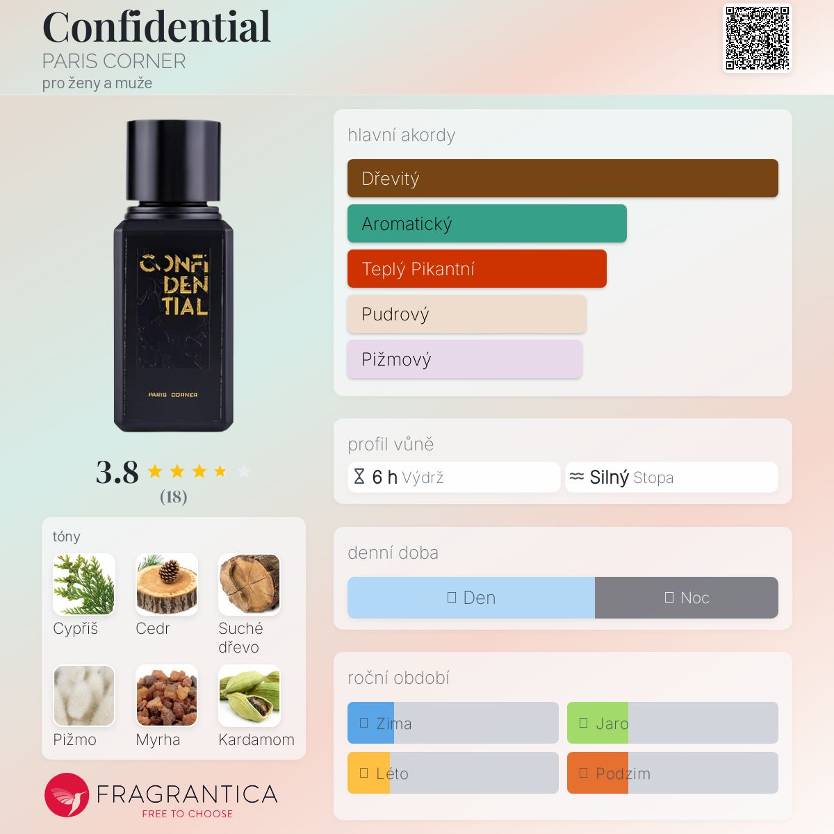 Confidential podle PARIS CORNER je Orientální Woody vůně pro ženy a muže. Toto je nová vůně. Confidential byl/a uveden/a v roce 2024. Vrchní tóny jsou Kardamom, Šafrán a Bergamot; střední tóny jsouCypřiš, Myrha, Jasmín a Růže ; základní tóny jsou Cedr, Suché dřevo, Pižmo, Santalové dřevo, Agarové dřevo (oud) a Tabák.