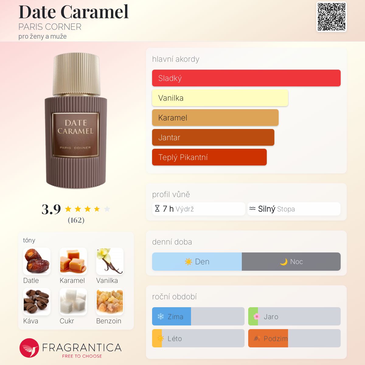 Date Caramel podle PARIS CORNER je Orientální Vanilla vůně pro ženy a muže. Toto je nová vůně. Date Caramel byl/a uveden/a v roce 2025. Vrchní tóny jsou Datle, Káva a Pomeranč; střední tóny jsouKaramel, Cukr a Benzoin ; základní tóny jsou Vanilka, Jantar (ambra) a Santalové dřevo.