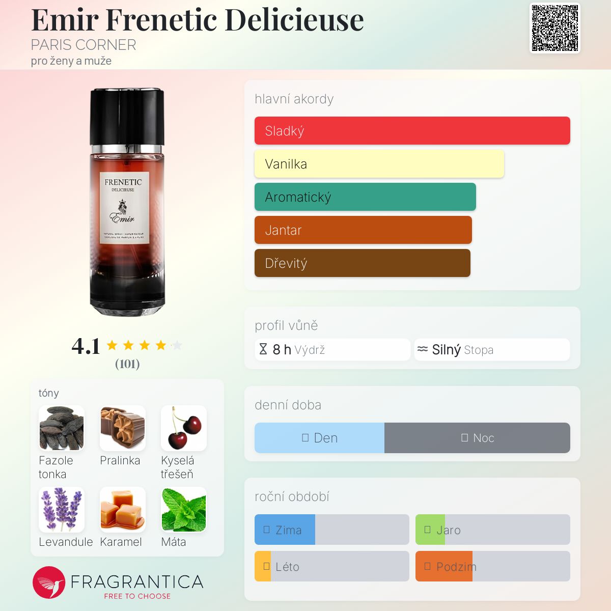 Emir Frenetic Delicieuse podle PARIS CORNER je Orientální Vanilla vůně pro ženy a muže. Emir Frenetic Delicieuse byl/a uveden/a v roce 2021. Vrchní tóny jsou Levandule, Máta a Bergamot; střední tóny jsouKyselá třešeň, Jasmín a Frézie ; základní tóny jsou Fazole tonka, Pralinka, Karamel, Vanilka, Santalové dřevo, Kakaový lusk, Benzoin, Cedr, Mléko a Kůže.