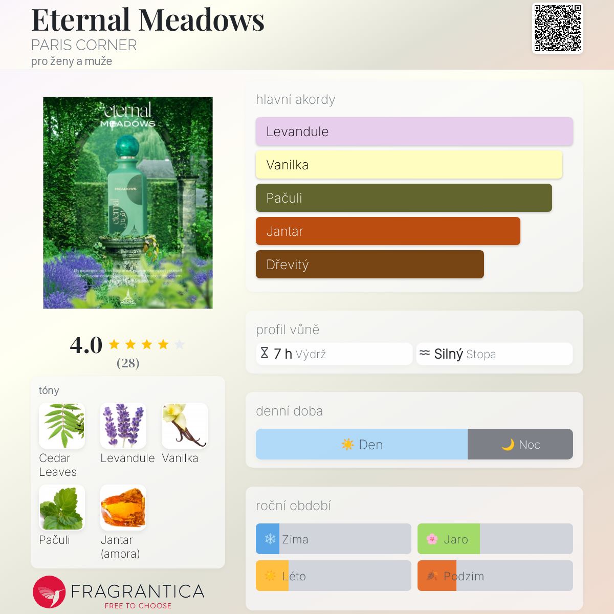 Eternal Meadows podle PARIS CORNER je Aromatic Fougere vůně pro ženy a muže. Toto je nová vůně. Eternal Meadows byl/a uveden/a v roce 2024. Vrchní tón je Cedrové listy ; střední tóny jsouPačuli a Vanilka ; základní tóny jsou Levandule a Jantar (ambra).