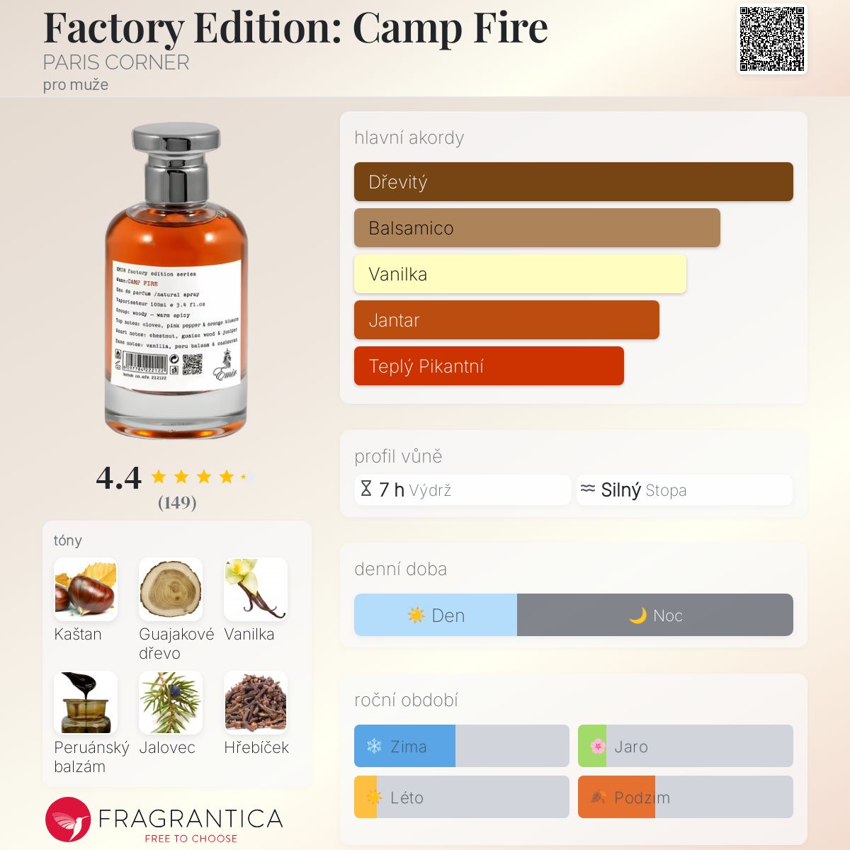 Factory Edition: Camp Fire podle PARIS CORNER je Orientální Floral vůně pro muže. Toto je nová vůně. Factory Edition: Camp Fire byl/a uveden/a v roce 2023. Vrchní tóny jsou Hřebíček, Růžový pepř a Pomerančový květ; střední tóny jsouKaštan, Guajakové dřevo a Jalovec ; základní tóny jsou Vanilka, Peruánský balzám a Kašmír.