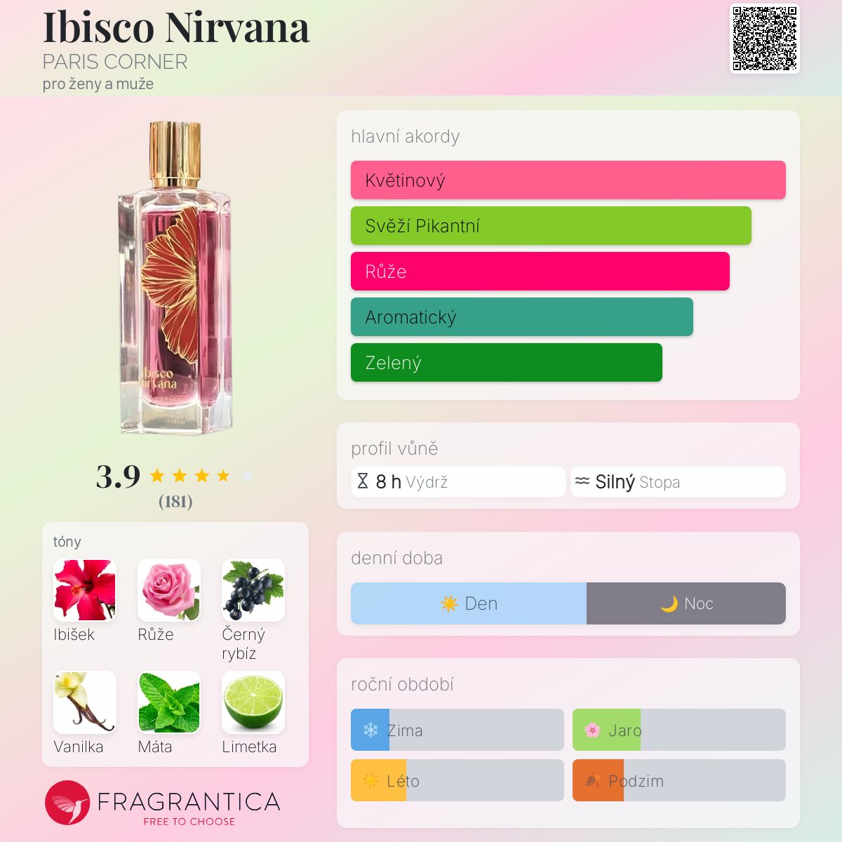 Ibisco Nirvana podle PARIS CORNER je vůně pro ženy a muže. Ibisco Nirvana byl/a uveden/a v roce 2024. Vrchní tóny jsou Černý rybíz, Máta a Limetka; střední tóny jsouIbišek, Damašská růže, Pelargónie a Skořice ; základní tóny jsou Vanilka, Kůže a Jantar (ambra).
